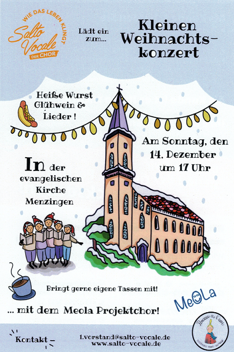Am 14. Dezember um 17:00 Uhr lädt der Chor Salto Vocale zum kleinen Weihnachtskonzert in feierlichem Rahmen in die ev. Kirche Menzingen ein. Mit stimmungsvollen Weihnachtsliedern möchte sich der Chor bei allen Unterstützern bedanken und die Konzertbesucher auf die besinnliche Vorweihnachtszeit einstimmen.